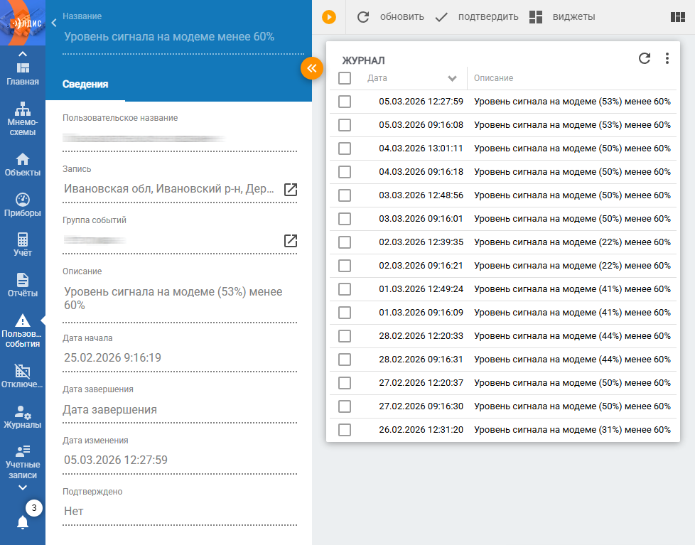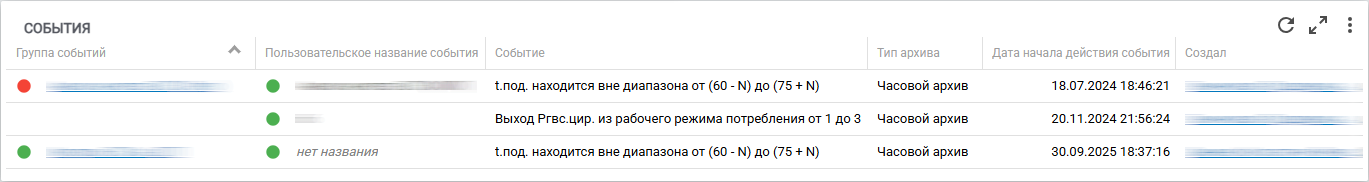3. Виджет «События» можно добавить на форму записи (объект, модем, ПУ, ТУ и т.д.). По умолчанию на виджете отображаются все события, связанные с данной записью. События выводятся в разрезе групп пользовательских событий, что позволяет просматривать события разных групп в одном виджете.