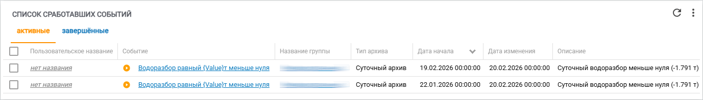 Важно: в списке активных событий отображаются только записи до момента их завершения. После завершения события информация переносится в лог завершенных событий и далее не обновляется.