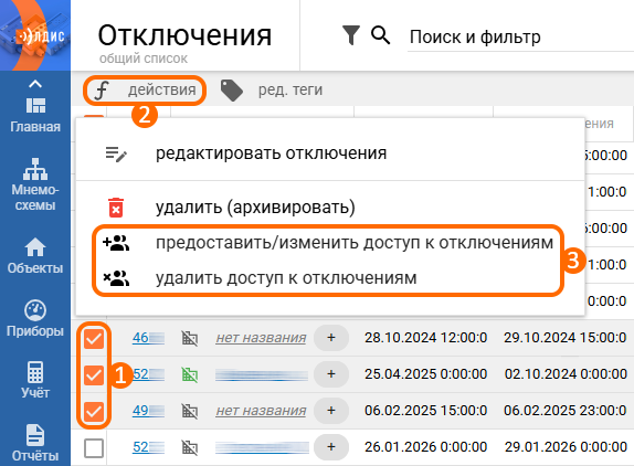 Для массовой настройки доступа к группам необходимо перейти в список отключений и выбрать нужные записи с помощью чекбоксов (рис. 13, элемент 1). Затем нажать на кнопку «Действия» (рис. 13, элемент 2) и в выпадающем меню выбрать соответствующую опцию (рис. 13, элемент 3). В появившемся окне следует выбрать организации, которым требуется предоставить или удалить доступ, при необходимости указать уровень доступа и нажать кнопку «Ок» в правом нижнем углу окна.