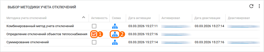 Далее во вкладке «Учёт отключений» требуется выбрать подходящий метод учёта отключений (суммирование отключений/определение отключений объектов теплоснабжения/комбинированный метод учёта отключений) посредством включения чекбокса (рис. 18, элемент 1) в виджете «Выбор методики учета отключений». Ознакомиться с принципом определения отключений согласно каждого метода можно по нажатию на значок схемы (рис. 18, элемент 2) в виджете.